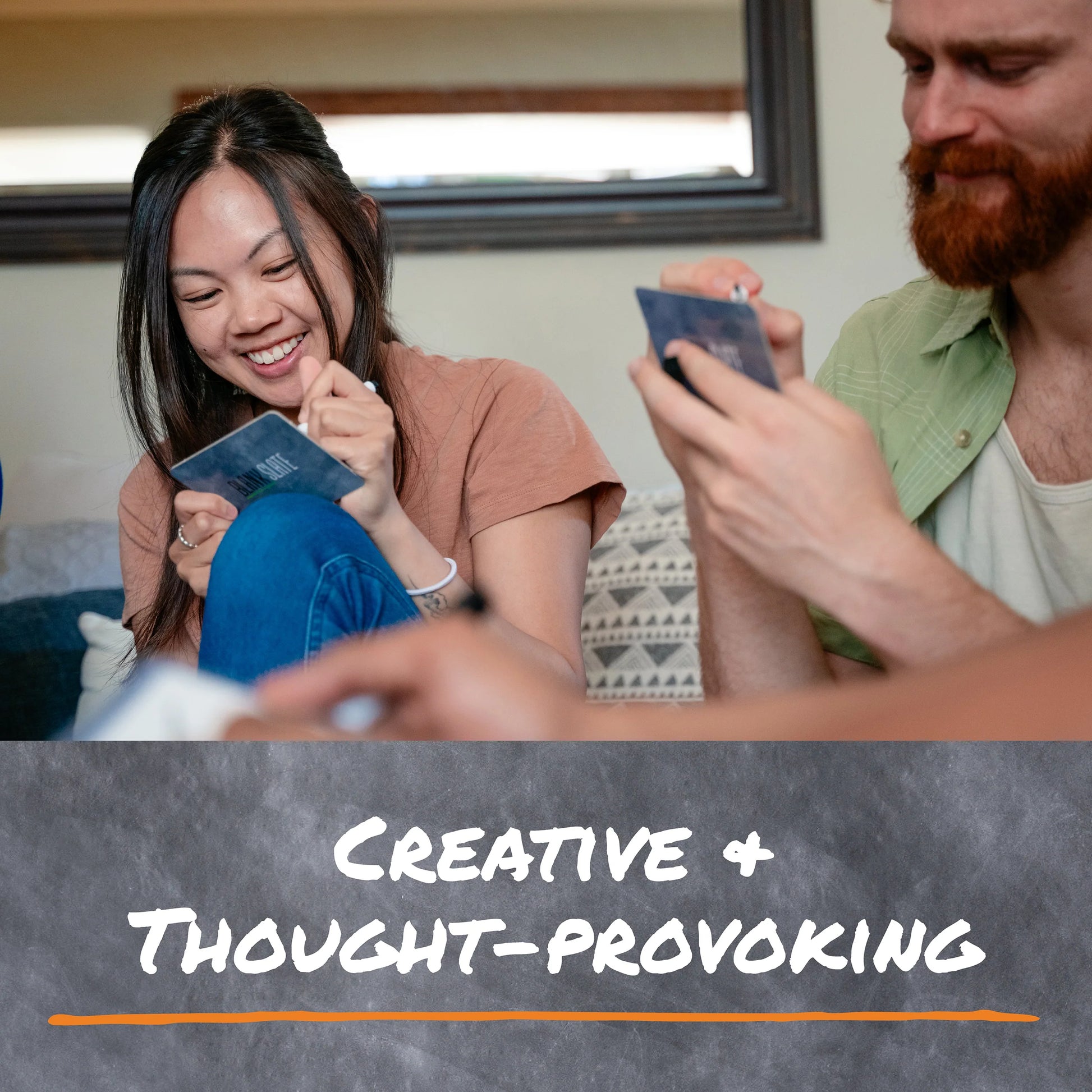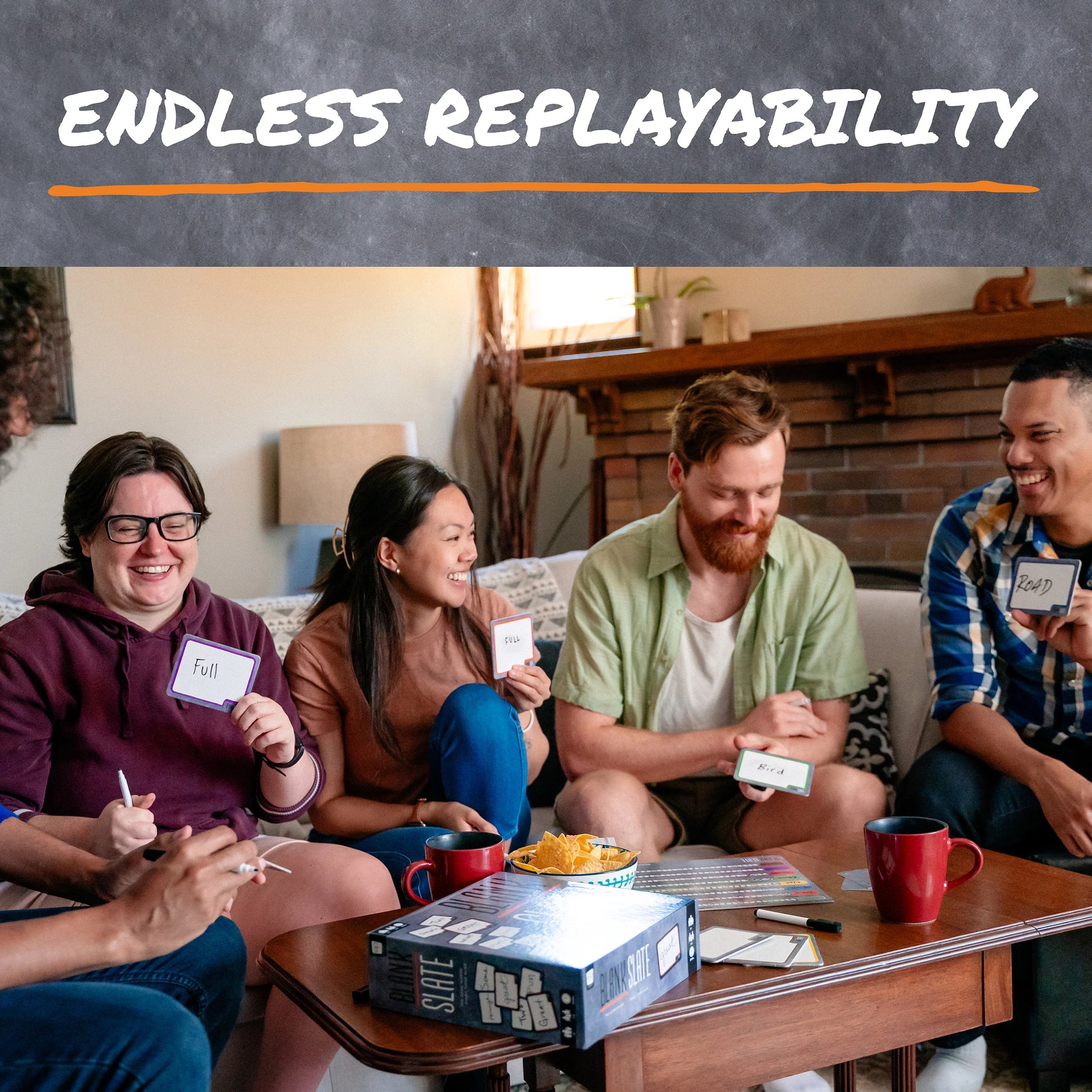 Each round in Blank Slate, pick one of the 250+ word cue cards (which have 500+ total cues) and reveal it. Each player then writes the word they think best completes the phrase, trying to exactly match another player's word without giving a single hint.