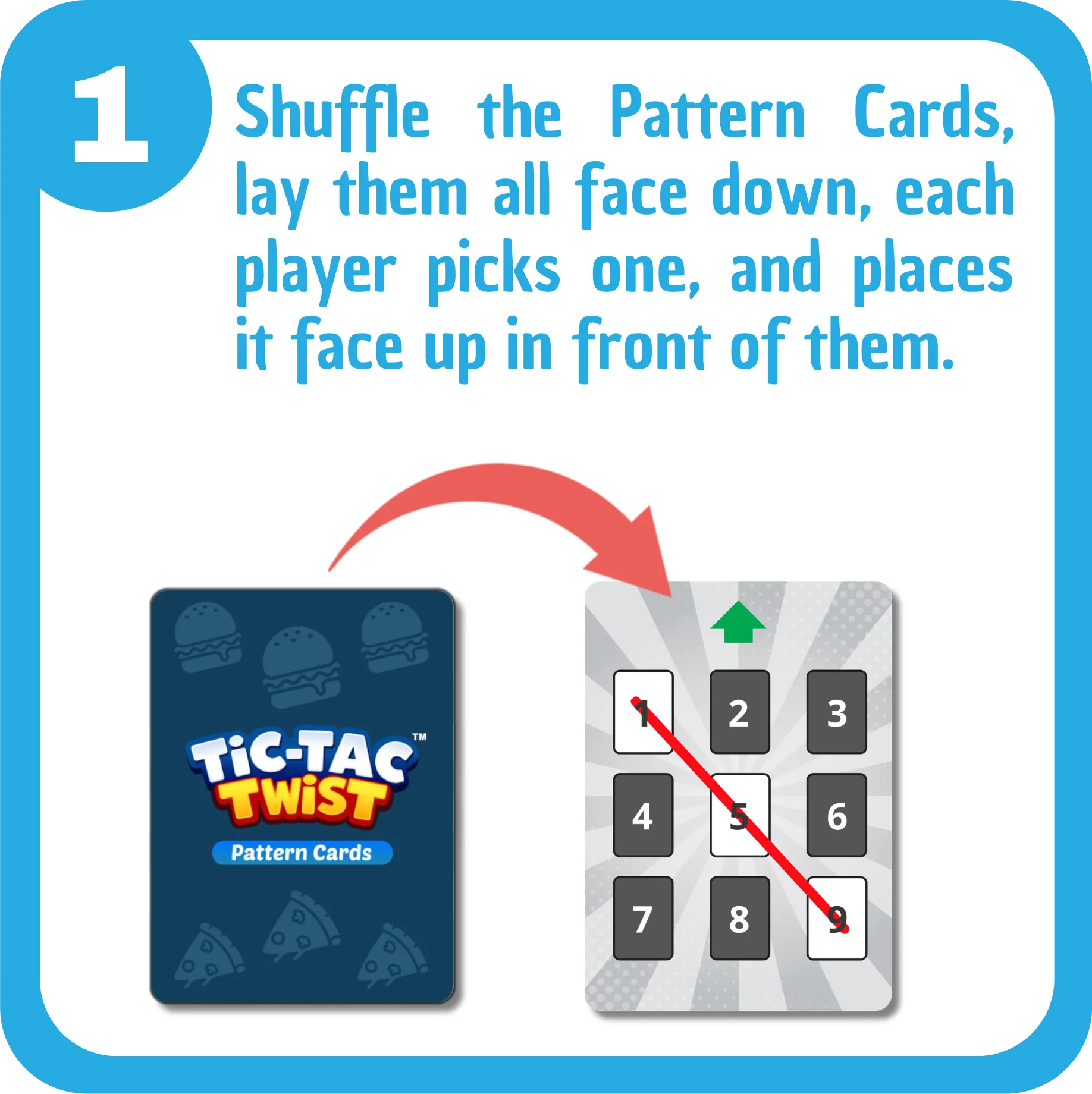 Be the first to make three in a row! But how do you get there? That’s where the real challenge begins. Each player starts with a Pattern Card showing the perfect combination they must complete on the 3×3 grid. On your turn, play cards to place, block, or swap foods as you race to match your pattern before your rivals do. But watch out! Action Cards can flip the board, steal your spot, or ruin your winning move in an instant.